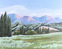 This 24x30 original acrylic landscape painting on gallery wrapped stretched canvas was inspired by the breathtaking landscape of Sun Valley, Idaho. With its majestic mountain peaks, tranquil valleys, and expansive skies, the scene captures the unique beauty of the region. Soft blues, lush greens, warm golds, and delicate pinks evoke the peaceful yet vibrant atmosphere of Sun Valley, all presented in a minimalist, impressionist style.