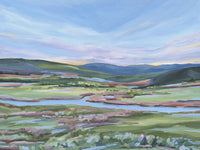 This 30x40 original acrylic landscape painting on gallery wrapped stretched canvas was inspired by the varied and colorful landscape of Colorado. With powder blue, vibrant green, muted rust and deep purple, the beautiful landscape in Edwards, Colorado (near Vail) is depicted here in a minimalist, impressionist style.