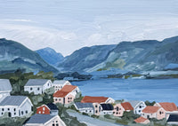 This original acrylic coastal painting on 5x7 paper was inspired by the small harbor town of Aurland in Norway. With moody blue and rusty red, this original village painting depicts the beautiful colors of the quaint Norwegian seaside in an impressionist style.