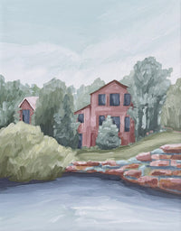 This 11x14 original acrylic floral painting on gallery wrapped stretched canvas was inspired by simplicity of a house tucked away in the foothills of Breckenridge, Colorado. With deep blue, soft green and deep red, this beautiful landscape painting is depicted here in a minimalist, impressionist style.