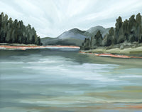 This 18x24 original acrylic landscape painting on gallery wrapped stretched canvas was inspired by the varied and colorful landscape of the Pike-San Isabel National Forests in the Front Range of Colorado. With deep green, soft blue and earthy rust, Colorado's beautiful Rocky Mountains are depicted here in a minimalist, impressionist style.