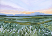 This 24x36 original acrylic landscape painting on gallery wrapped stretched canvas was inspired by the varied and colorful landscape of Colorado. With periwinkle blue, vibrant green, and soft lavender, this summer scene in Colorado Springs is depicted here in a minimalist, impressionist style.